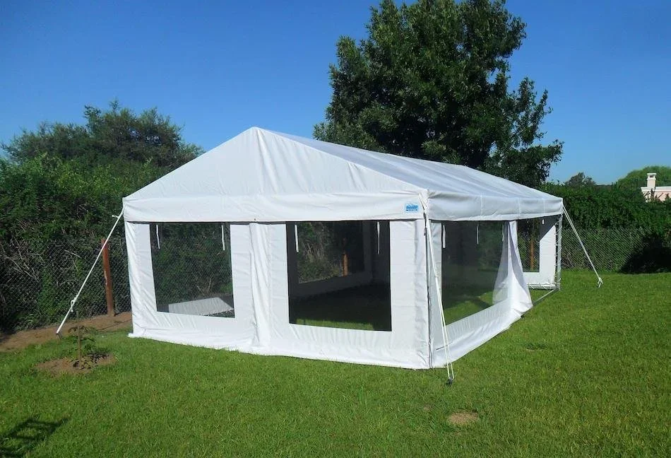 Estructura de acero reforzada, lona impermeable, personalizables.